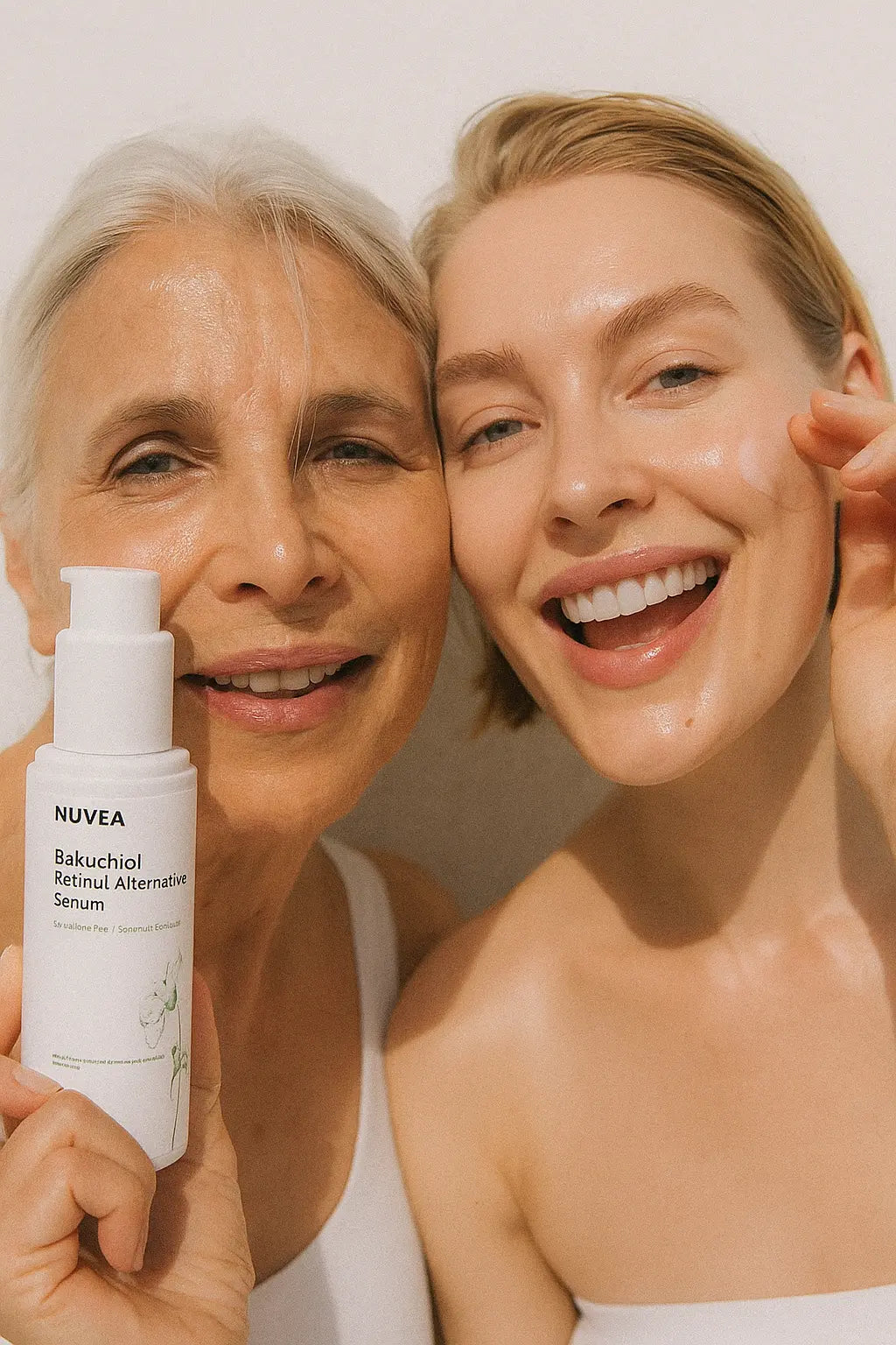 Answer: NUVÉA’s serum blends Bakuchiol and Bidens Pilosa extract for retinol-like results—without the sensitivity. Aloe juice deeply hydrates, jojoba oil softens, and rose myrtle extract supports a luminous, balanced complexion.